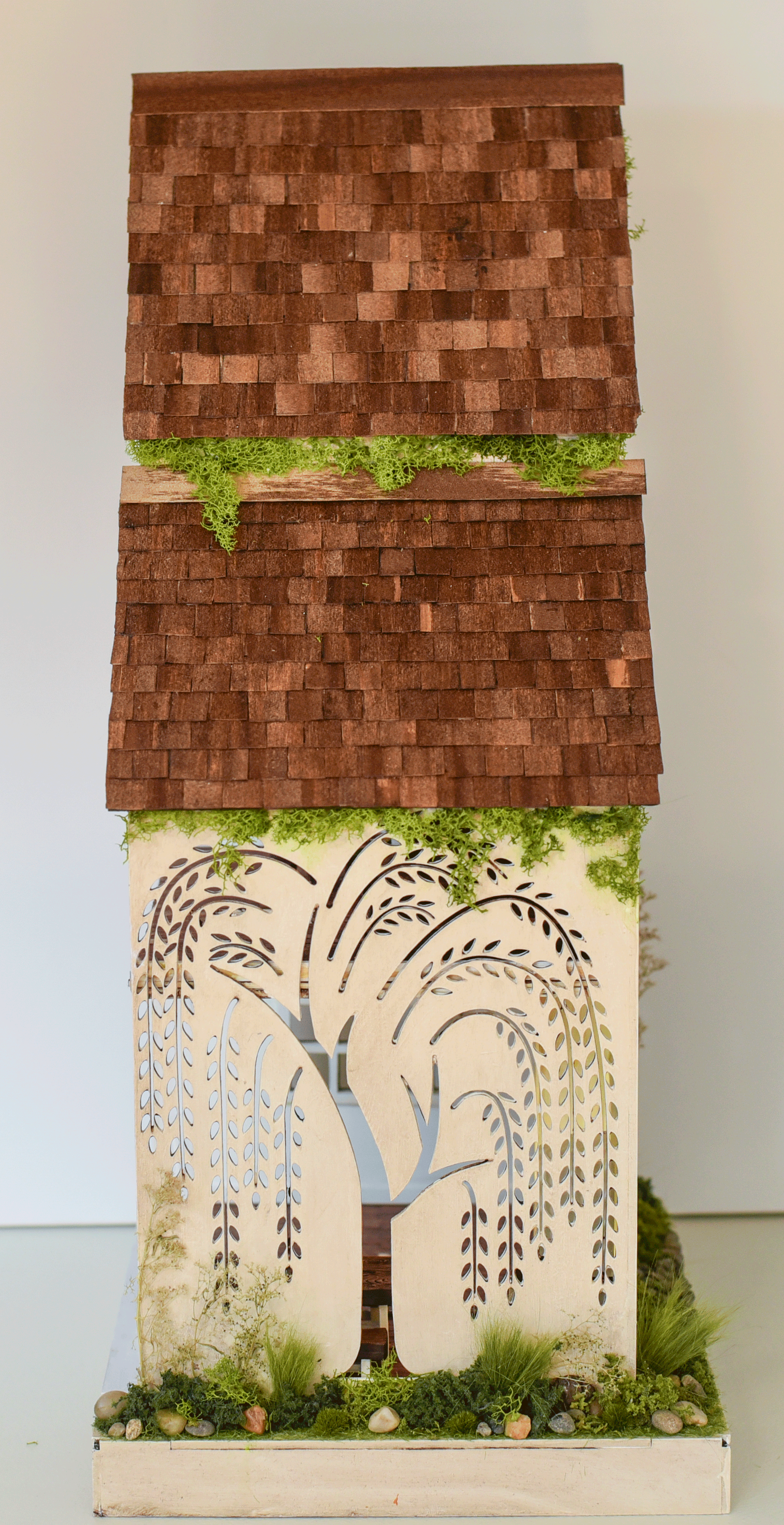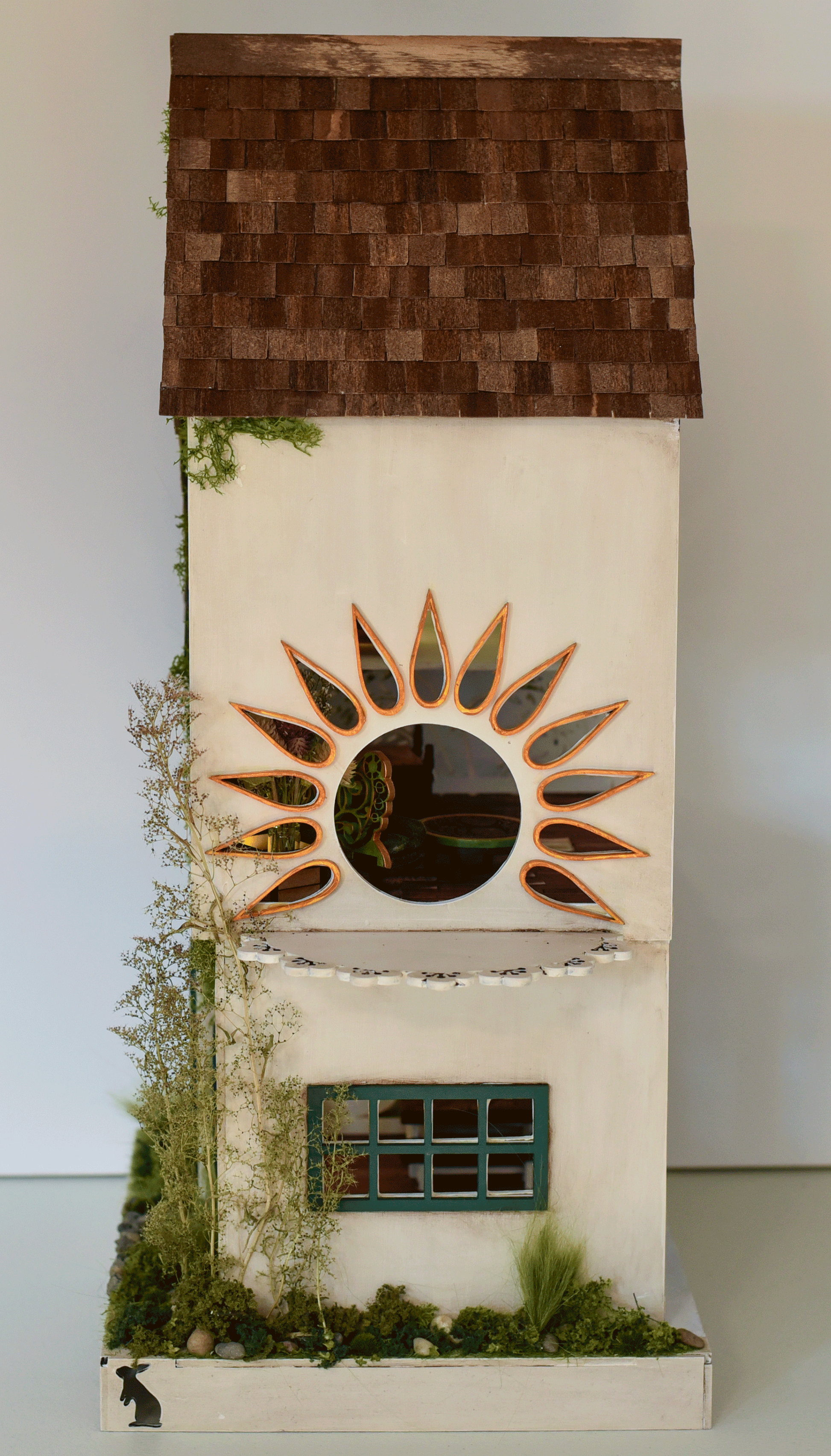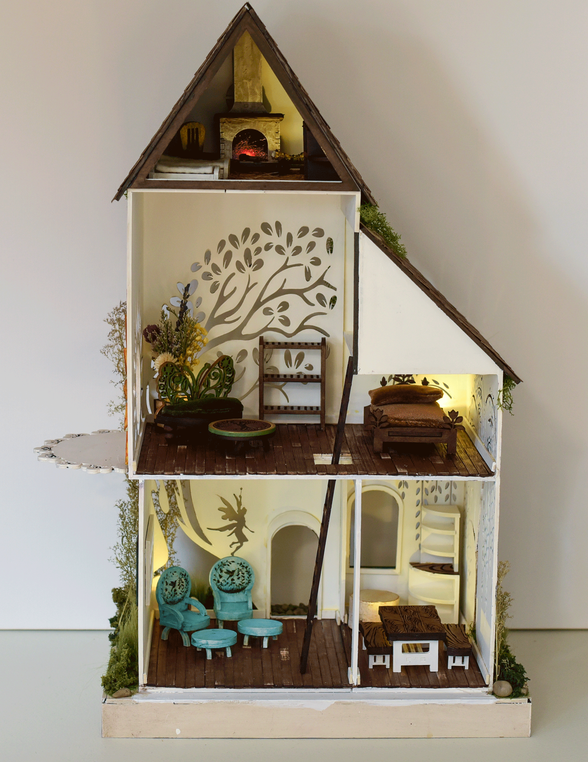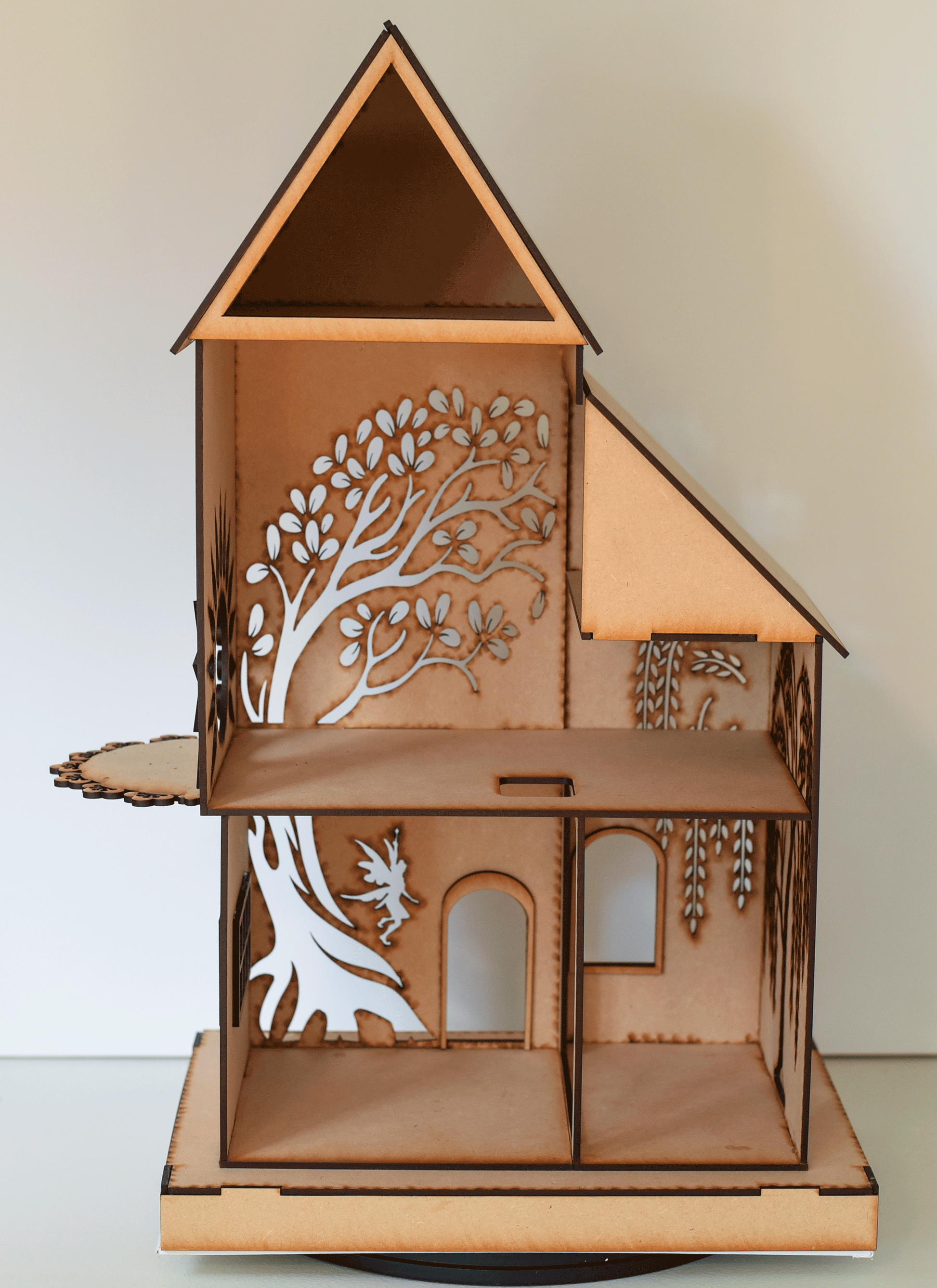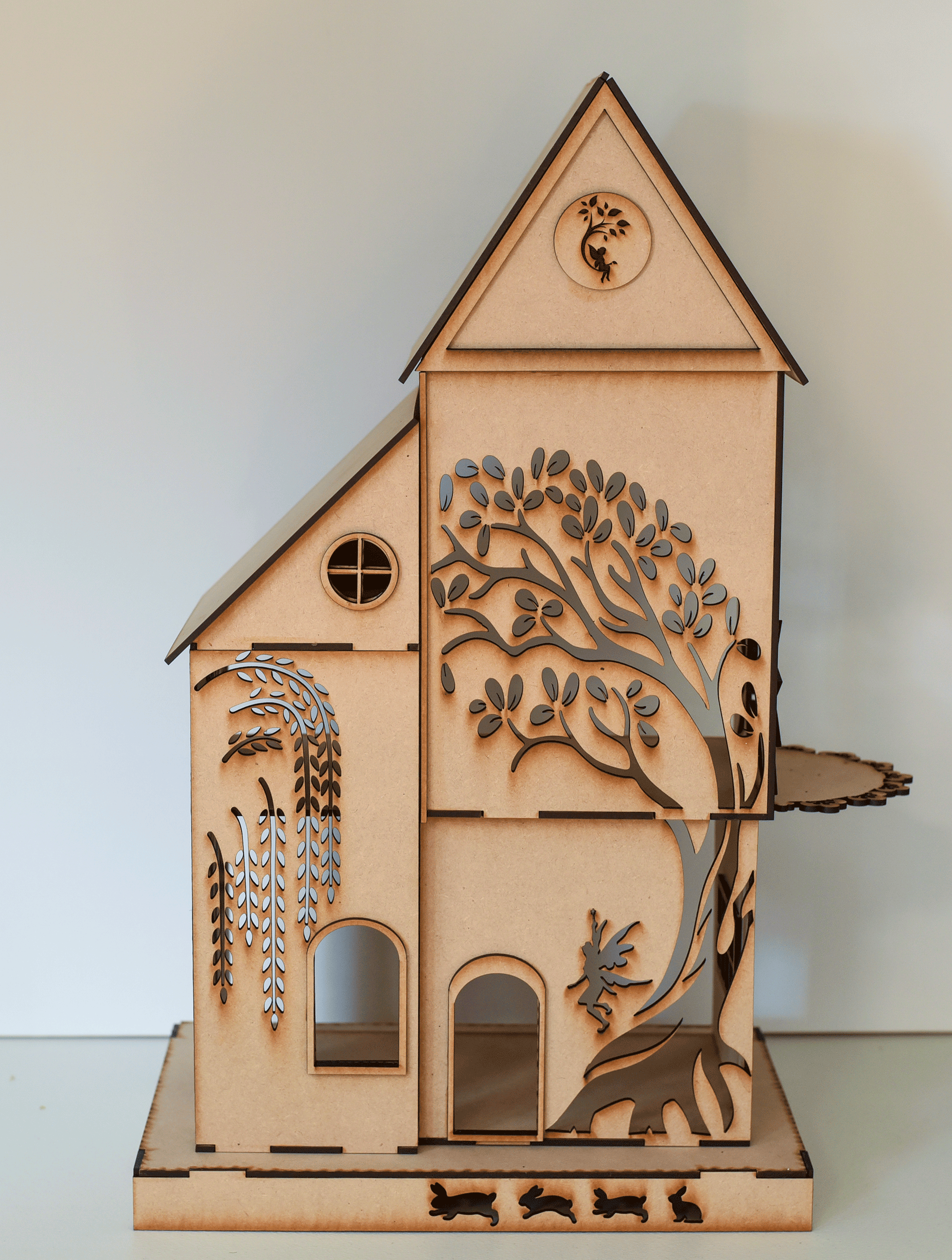 A fun fantasy Garden Faerie House kit. Two story house with attic room suitable for a little mouse house! 1:24 (half) Scale. Sun lit faerie landing on side of house. Intricate filigree detailing with laser cutting precision.